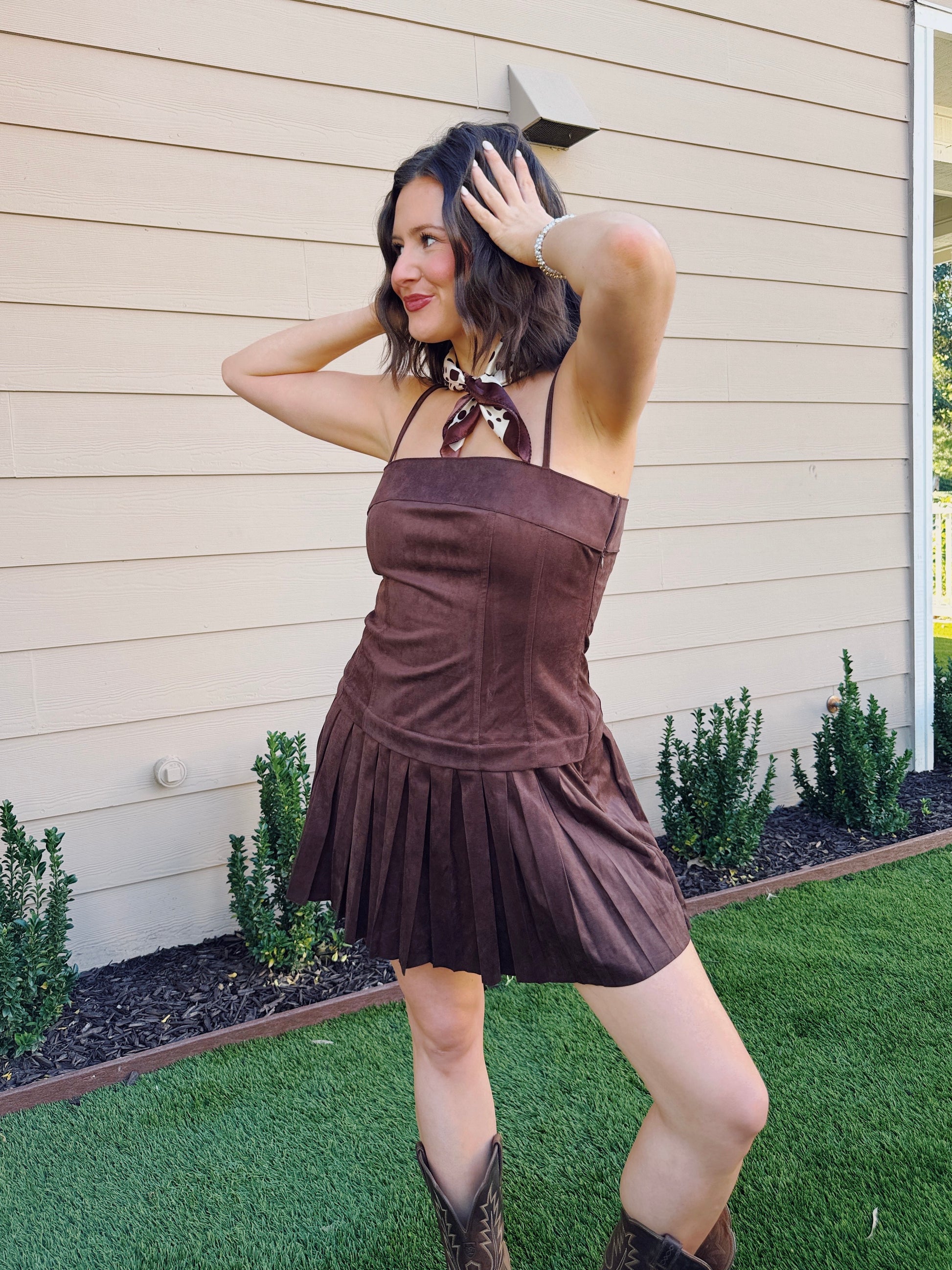 Soft, sleek, and undeniably chic, our Cowgirl Crush Suede Dress is the perfect way to add a little southern charm to your wardrobe. Designed with an oh-so flattering square neckline and adjustable spaghetti straps, this flirty, easygoing piece is made for concerts, nights out, and every “look cute without trying” moment. The suede texture, structured bodice, and pleated skirt bring that perfect western edge, while a hidden side zipper ensures a smooth, seamless fit. Whether you’re dressing it up with boots for a country concert, or adding simple jewelry for a night out, this dress delivers a polished, wear-anywhere silhouette you’ll reach for again and again. It's a ride-off-into-the-sunset kind of staple!